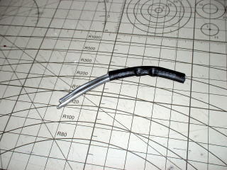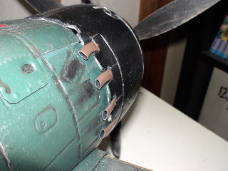 各排気管に合わせてカットしカウルから出ている側は瞬間接着剤を塗布した後クリップで挟んですぼめます。 上がキットの排気管、下が作製した排気管 |