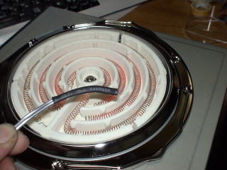 上記の物を電熱ヒーターで炙ります。この時にあまり炙り過ぎるとヒシチューブが中のハンダにしっかりと食いつき外せなくなりますのでほどほどに。 我が家にはドライヤーがありませんのでヒーターを使用してますがドライヤーの方が作業は楽だと思います。 |