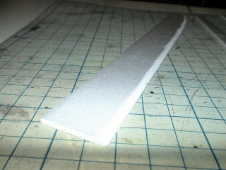 主翼先端の足りない部分は積層したスチレンを接着しラインに沿ってカットして削って形を整えます。 |