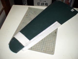 できあがった羽布張りモールドをエルロンに接着します。このままだとモールドが深過ぎるのでペラペラになるくらい削ります。 ※2007/08/03 変更 1mmスチレンを元とした場合、表面の粗さとエルロンの厚みがやや大きいのが気に入らなくなり羽布張りは上質紙から切り出して木工用ボンドでエルロンに貼り付ける方法に変えました。 |