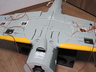| サーボの配線を溝に沿わし目隠しのテープを貼りました。 すでに主脚とフラップ内部に塗装をしてあります。 |