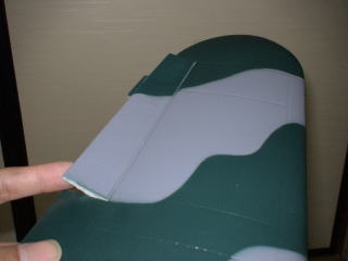 上反角を持った状態で上から見て前縁と後縁に向けまっすぐにラインテープを貼ります。このラインからはみ出ている部分をペーパーで削ります。 |