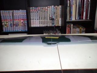 主翼をそのままカンザシを入れ左右主翼を合わせると上面カーブの中央面がせり出しており、またスパーがあたるので適度に削る必要があります。 |