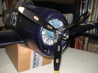 F6F作製時において最大の妥協点・・・。 零戦などに装備してあるFSK9×8と直径が同じはイヤ・・・ブレードが細いのはイヤ・・・と、わがままをこねて辿りついたGWS EP10×6。 初FLTにて必要最低限の働きはしたものの、まったくF6Fらしさを感じません。 スロットルをフルに入れても手ごたえが薄く「これぞ!2000馬力〜」とは到底思えず惨敗です。 |