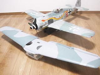 | 今年は雷電をお供にする事が多いためあまり出番が来ない購入した時はFreeWing製でいつの間にかFlightLine製となっていたFw190。 所有各機でバッテリーのサイズが違うのが増え管理が煩雑にかんじたので雷電とバッテリー4S 3300mAhが共用できるかどうか確かめるために引っ張り出しました。 |