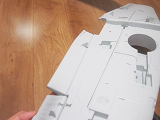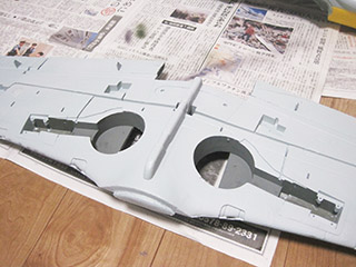 | カットしたフラップ個所の上翼部分を再生します。 余っていたスチレンを適当なサイズにカットし接着。 |