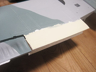 | 主翼はフラップ部のみ塗装する予定でしたが、よくよく考えると胴体を再塗装する事で主翼と胴体の色味を合わせるのは大変だと気づきます。 主翼全体も塗装した方がいいな! ってなわけでサーフェーサーを吹き付けました。 だいぶ地肌の違いも感じなくなり結果オーライです。 |