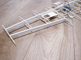 | 胴体側面に縦通材として2mmバルサ角柱を接着しました。 | |