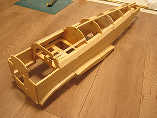 | 縦通材を接着。 側板上ブロック状の物はなかなか沿わずに苦労しました。 |