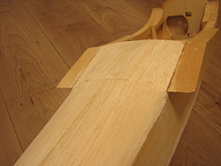 | 翼端に半月状のブロック材を接着。 最後の削り出し作業で翼端を整えていきます。 |
