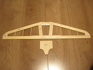 | 主翼のリブは航空ベニヤではなくバルサ材です。 途中でパキっといきそうで怖い。 バルサで強度は大丈夫なんだろうか?まぁ、プロが設計したものだから私の自作より確かだろう。 |