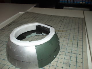 内径にスチレンを沿わせて接着したのは前部にスチレンを接着するためのノシしろがなかったからです。 ノシしろができたところで4mmスチレンを接着しおおまかにカッターで切り出してからペーパーがけして形を整えます。 画像はカッターでおおまかに形を切り出した状態 |