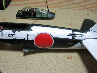主翼は左右分割。日の丸、ラインといったマーキングがなされております。ラインが少し浮いているので見てみると塗料ごと浮いてました。 どうも食いつきが悪いようです。 |
