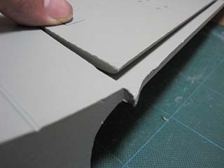 | 次に追加となる五二型のモールド個所です。 最初にカッターで薄く三角に切り取り、その後丸めたサンドペーパーで徐々に元のモールドと同じくらい広く深くしていきました。 |