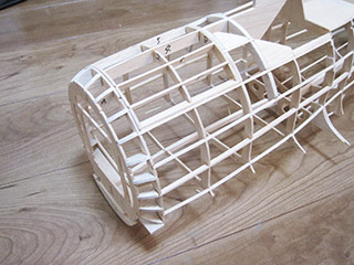 次は胴体。 重心位置の適正化を図るため操縦席後方から尾灯までを20mm短縮。重量軽減のため骨組みの材質変更と胴枠削減。 |